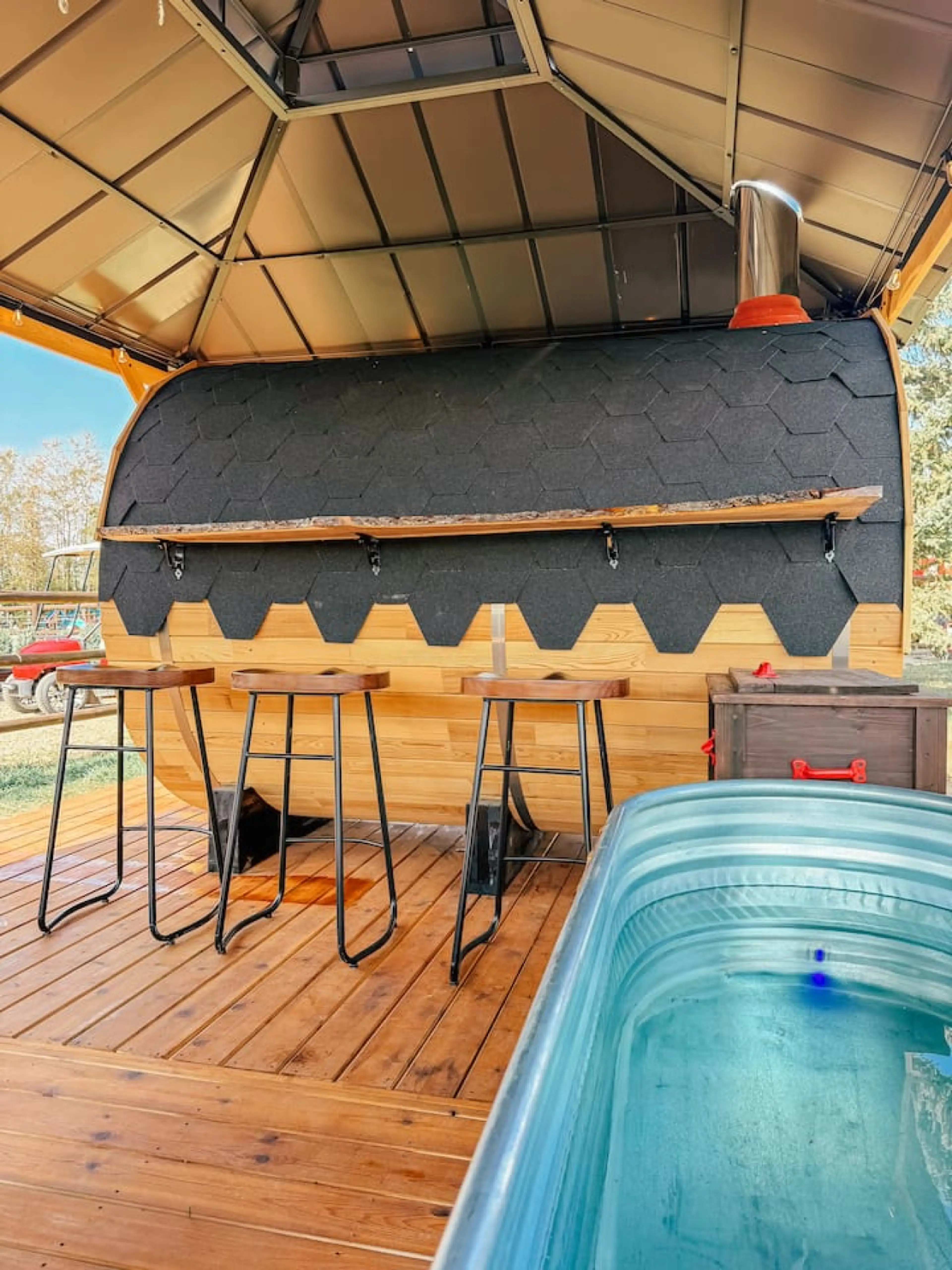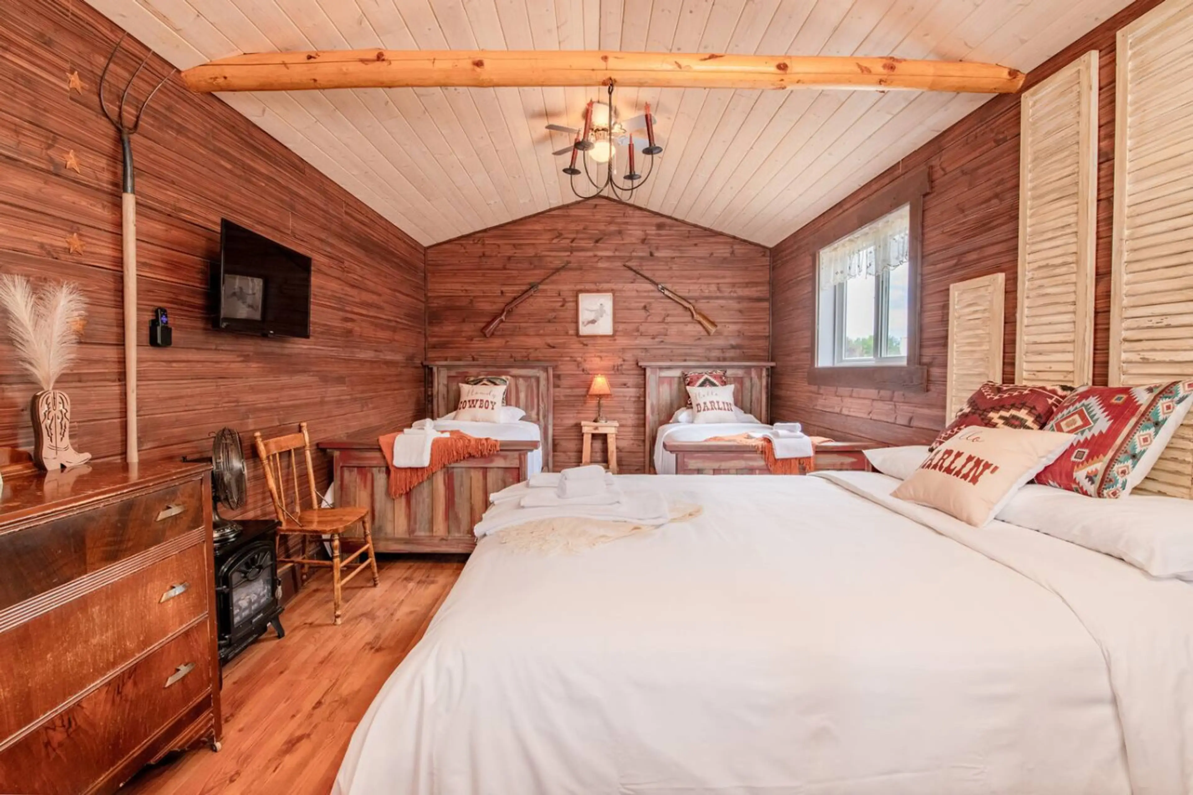 Saddle up in this western-style cabin with rustic wood walls, rope accents, and cowboy charm. Sleeps 4 with 1 queen and 2 twin beds, complete with linens, towels, AC, fan, mini fridge, fireplace, and TV. Guests receive scan card access to a private bathroom with heated floors (24/7, quiet hours 11PM...