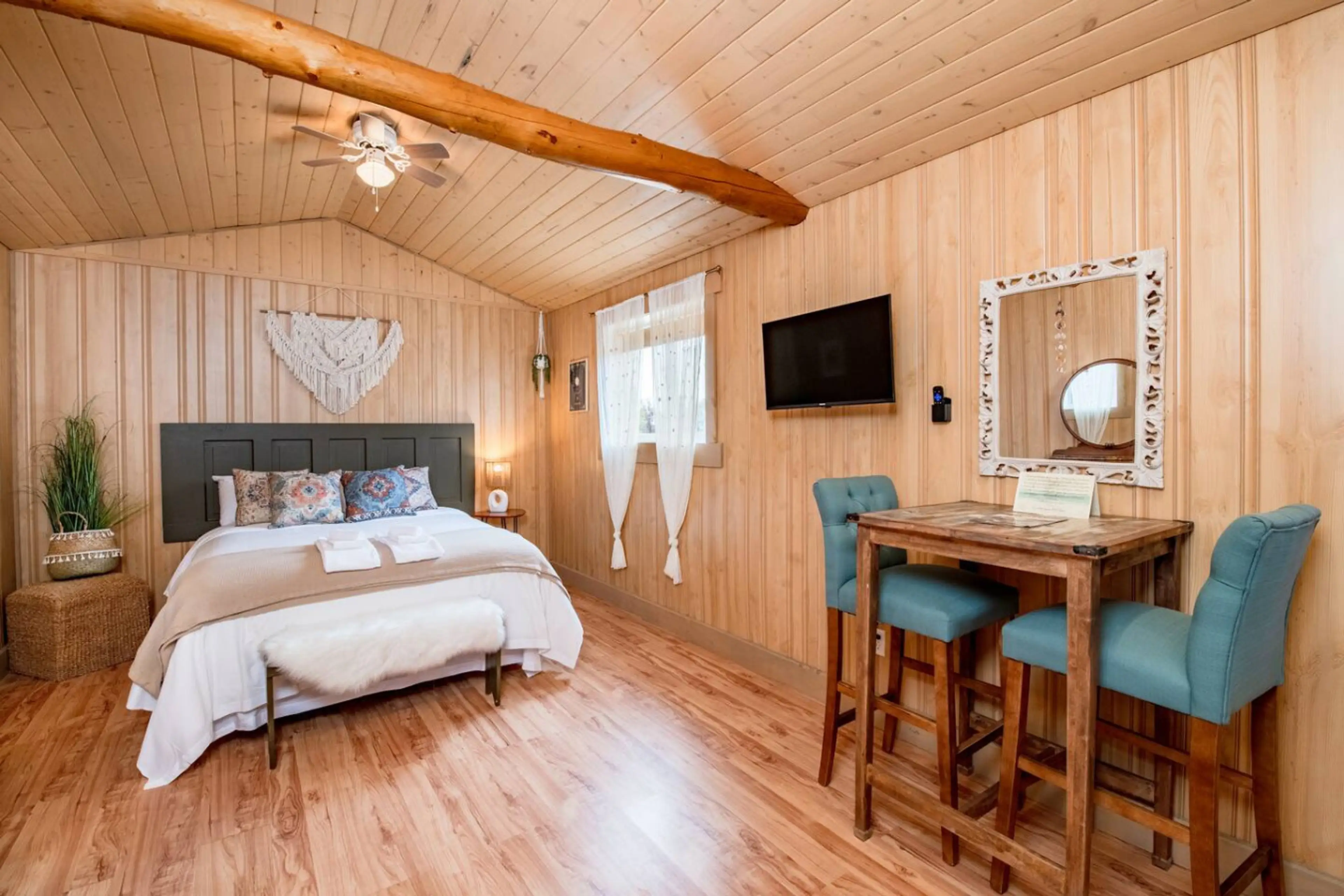 Step into a cozy boho-inspired cabin retreat with vibrant charm and earthy textures. Perfect for 2 guests, with a queen bed, AC, fireplace, fridge, TV, linens and towels. Private bathroom/shower access via scan card. Enjoy access to our unique wellness area: soak in a hillbilly-style wood-burning ho...