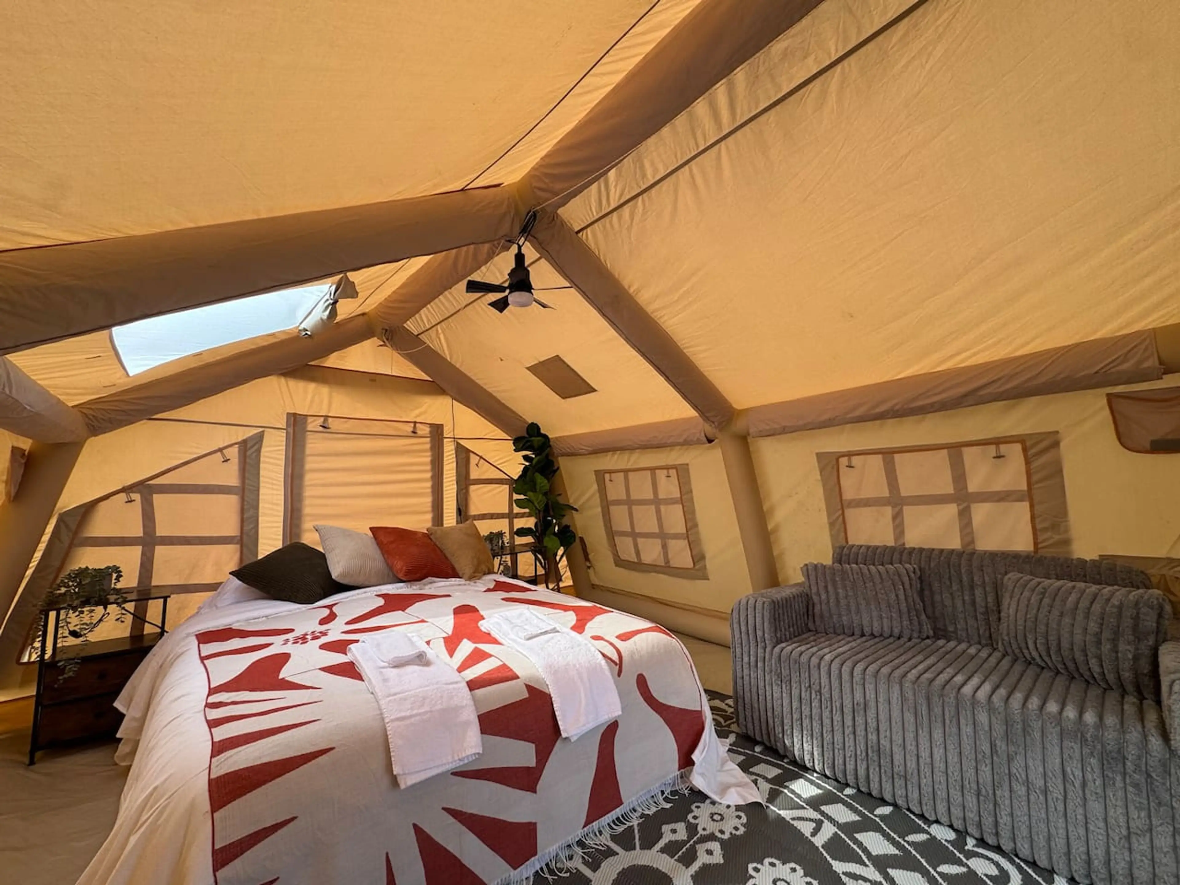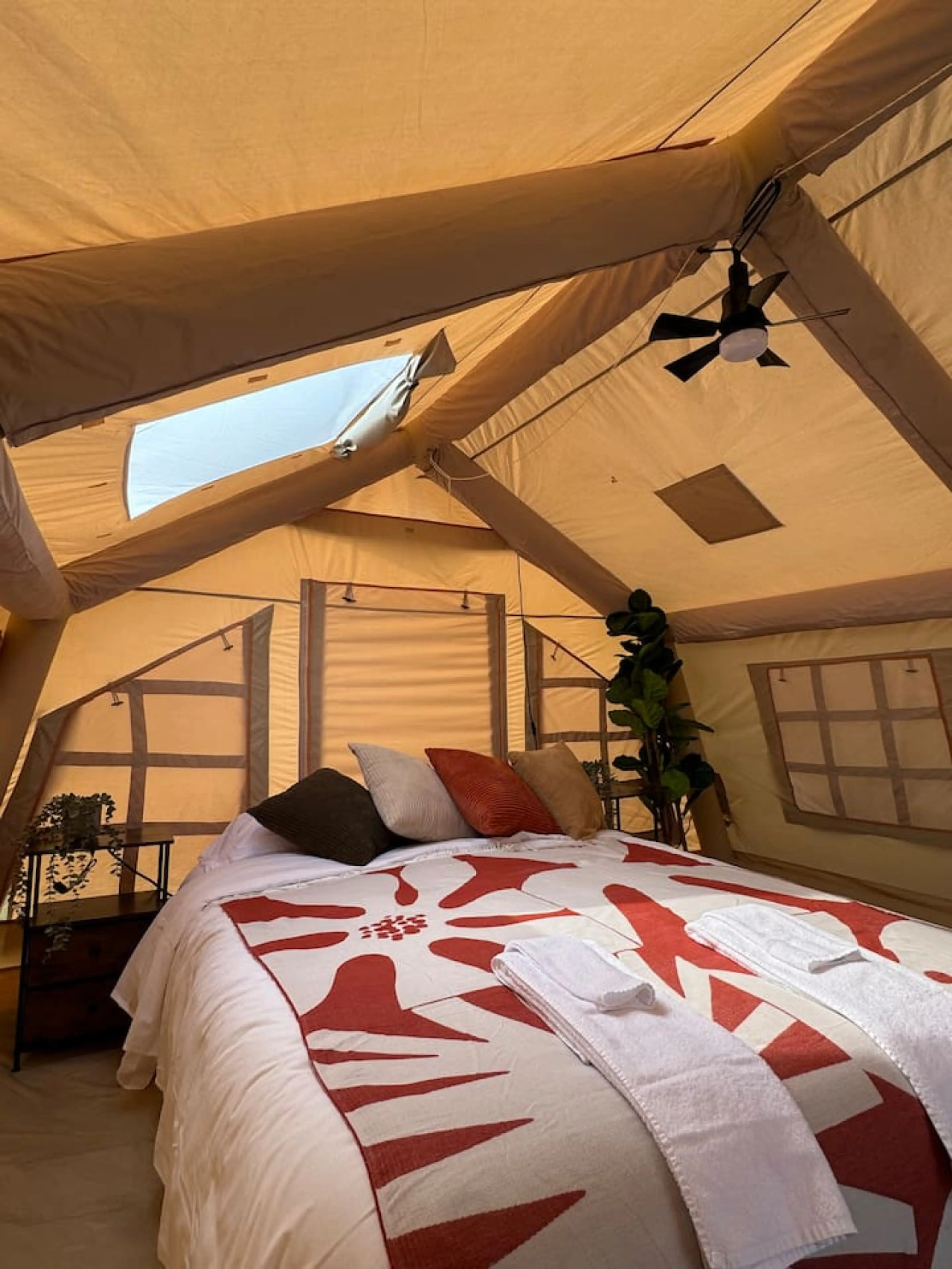 Step into a cozy boho-inspired glamping tent with earthy textures, perfect for 2 guests. Sleep in a queen bed with fresh linens and towels, kept warm year-round by two heaters for winter comfort. Enjoy access to resort washrooms with secure entry, showers, and coin laundry. Relax in our Hydro Therap...